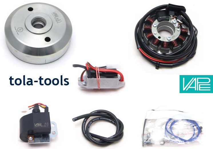 Lichtmagnetzündanlage mit integrierter vollelektronischer Zündung, Lichtleistung 12V/180W Gleichstrom. Kontaktlose elektronische Zündung mit eigener Stromversorgung innerhalb der Anlage. Ersetzt die alte Bosch Licht-Zündmaschine nebst Fliehkraftversteller, Unterbrecher, Zündspule. Das System ist technisch in der Lage komplett ohne Batterie betrieben zu werden. Es sind keine Modifikationen am Motorgehäuse notwendig.