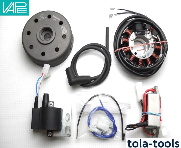 Lichtmagnetzündanlage mit integrierter vollelektronischer Zündung. Lichtleistung 12V/100W Gleichstrom. Kontaktlose elektronische Zündung mit eigener Stromversorgung innerhalb der Anlage. Ersetzt die alte Lichtzündanlage. Es sind keine Modifikationen am Motorgehäuse notwendig.