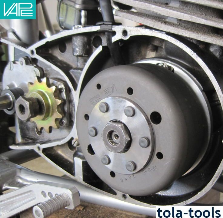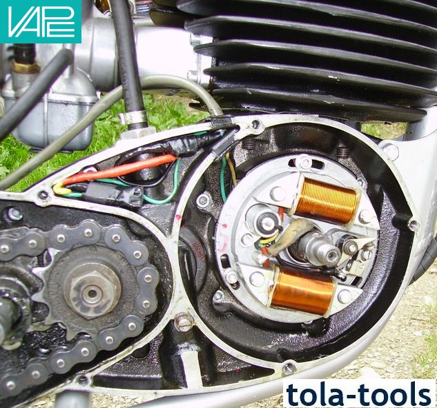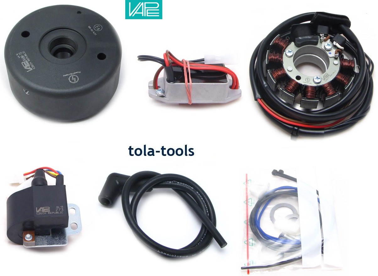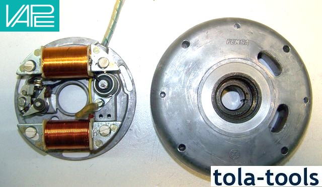 Magnet based generator with integrated ignition. Output at 12V/100W DC. Solid state ignition with own power supply from within the system. Replaces stock Femsa magneto (110 mm, big shaft) as well as ignition coil and regulator parts. No modifications on engine housing necessary.