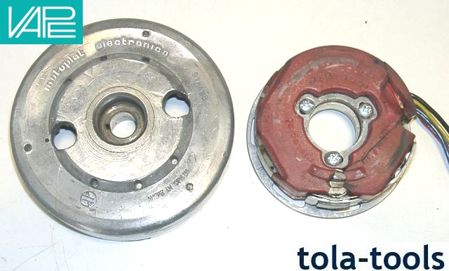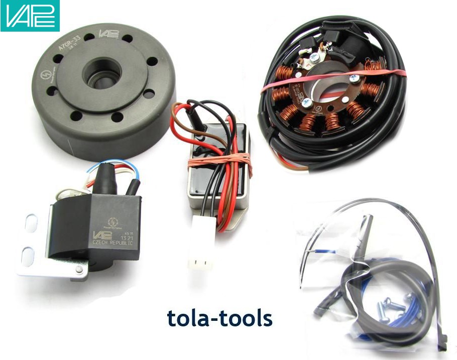 Integrated solid state ignition, light output 12V/100W DC. Replaces original Motoplat magneto or SEM system. Does not require any modifications on engine housing.